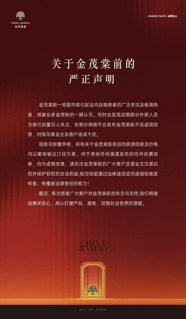 例如,金茂上海公司通过微信公众号发布严正声明表示,发现部分外部人员为了吸引流量,引人关注,在部分网络平台发布金茂棠前项目的不实返现信息,对准业主及客户造成干扰。另据市场公开信息,上海建工房产公司以及象屿地产等公司也在近期发布相关严正声明。